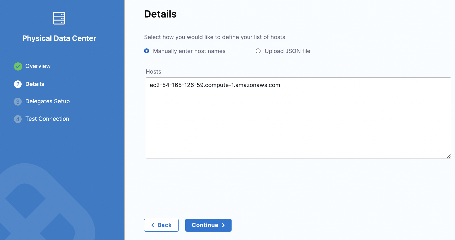 The Specify hosts or Select preconfigured hosts from Physical Data Center options are used when you are deploying to a pre-existing infrastructure.