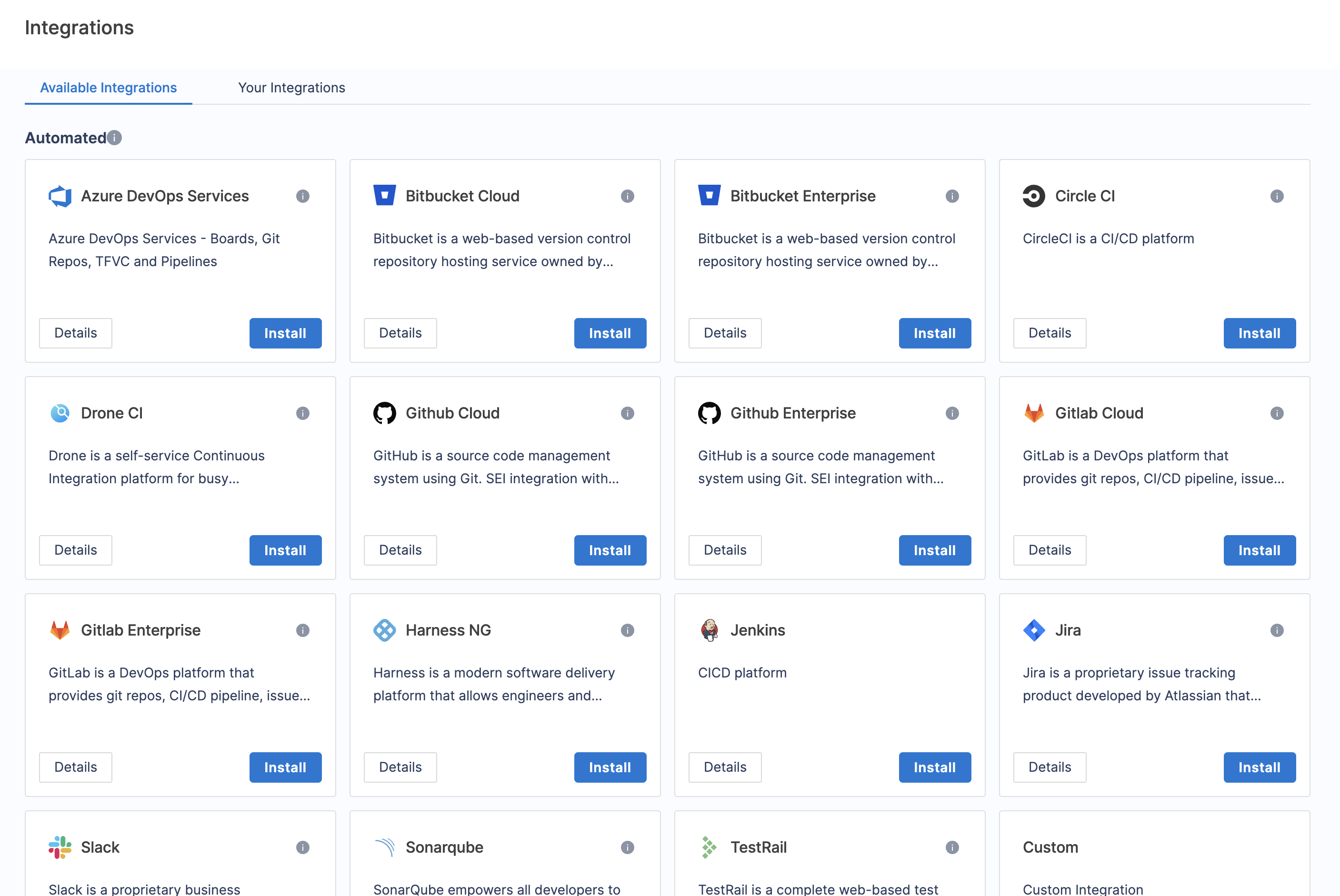 SEI supports custom CI/CD integrations through webhooks. You can use this for CI/CD tools that don't have a dedicated SEI integration. For information about custom CI/CD, go to Custom CI/CD Integrations.